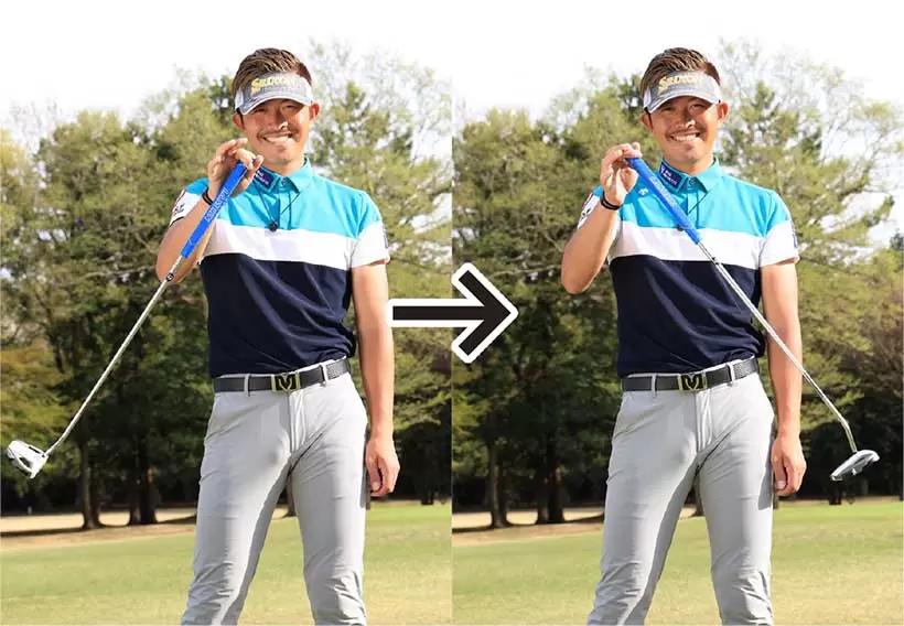 パターを吊るし気味に持ち、左ヒジから先とパターが一直線に見えるような構えを作ろう。
