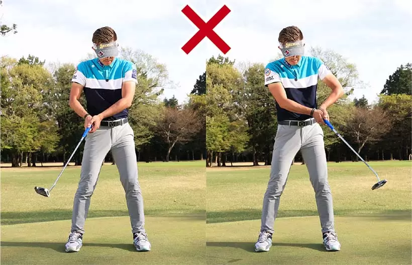 腕や手を使わず、お腹の小さい回転でテークバックする。