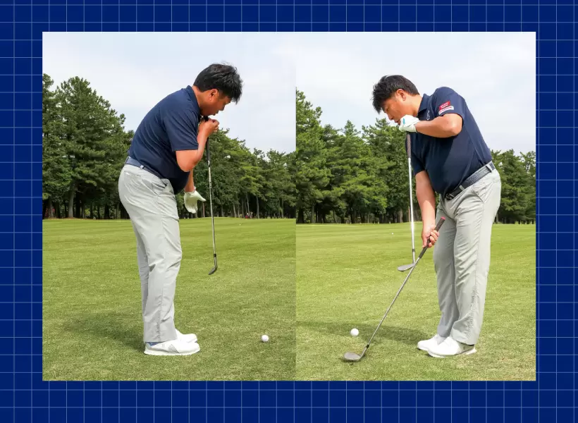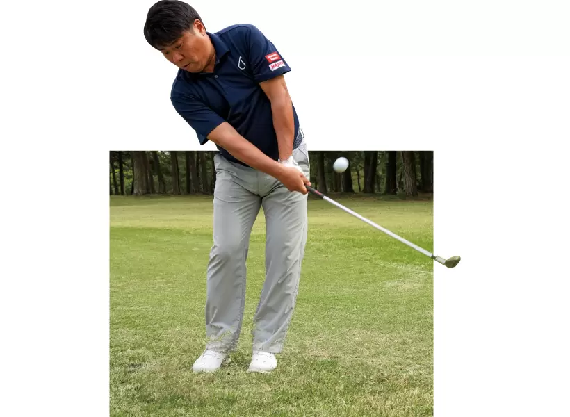 練習では右手で左ヒジを抑えたまま片手打ちすると、左腕を伸ばしたままアプローチする感覚をつかみやすい。フォローでは少しインサイド方向に抜くイメージでもOK。