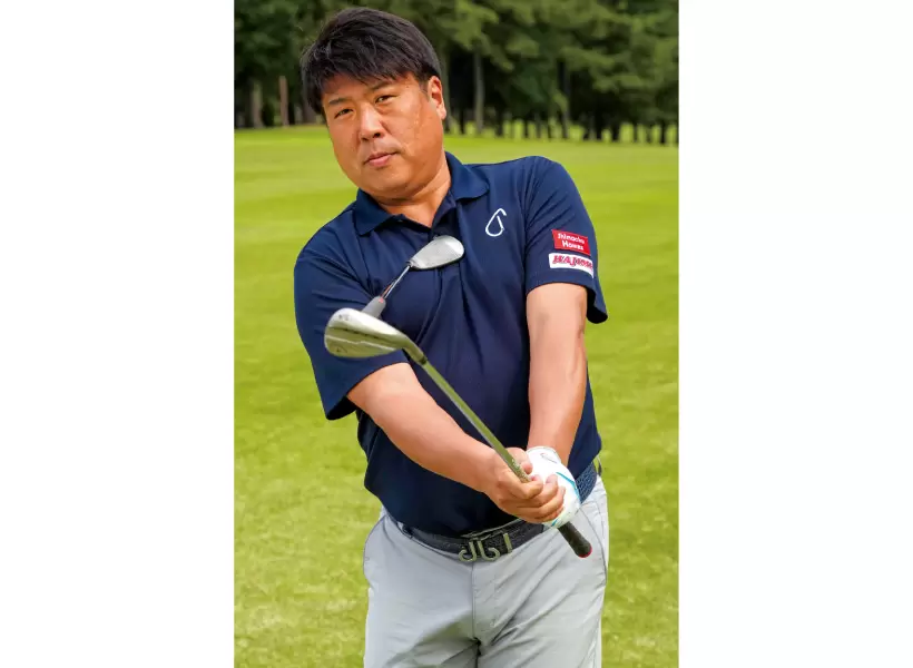 体の回転で距離感を出すには、フォローで胸が目標方向を向いている姿勢が大切。フェース面を変えずに、胸が回転できるようになると、体で距離感を出せるようになる。