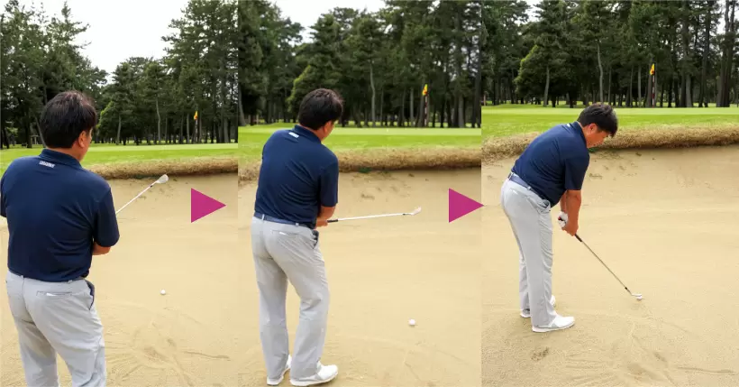 バンカーは左足一本で立っている感覚でOK!左足体重になっているほど、ヘッドを打ち込んでいきやすいので上手く砂を飛ばしてボールがフワリと上がる。