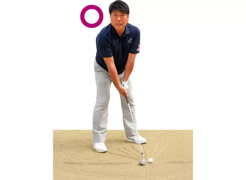 最初にフェースをセットしてから、スタンスを時計の10時くらいの位置に移動させると正しいバンカーショットの構え方になる。