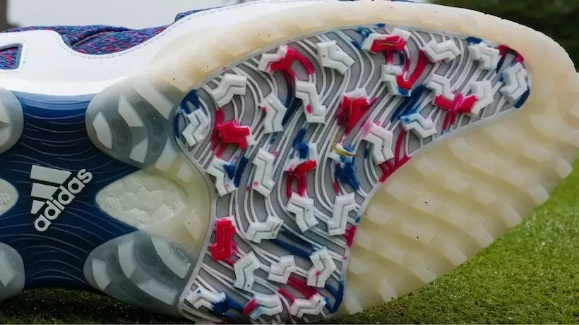 右が外足側のフィニッシュ時に大きな負荷がかかる部分。足底から出っ張る形で機能させている。力のかかる4箇所が、このような形で補強されているため、高い安定性とグリップ力を発揮する。