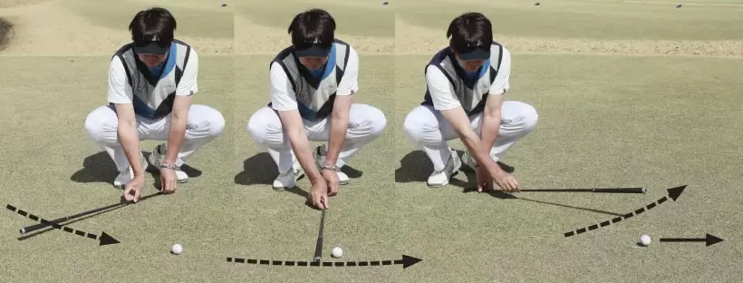 インサイドからインサイドに“曲線”を描くことで、ボールを目標方向に飛ばすことを体感する実験をしてみよう。地面に置いたボールを払い打てる高さでクラブを構えて、右から左に弧を描くようにシャフトを動かすと、ボールは引っかからずに真っすぐコロがります。