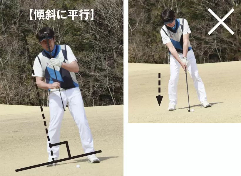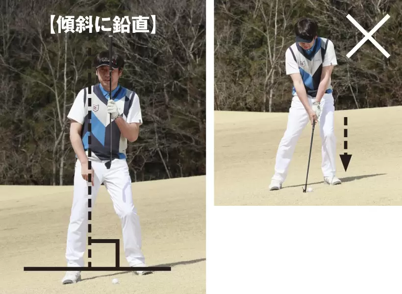 傾斜に逆らって、地面と鉛直に立つ方法では、アドレス時に体重が左にかかりすぎていてバランスを欠いている(※左足上がりの場合)。また抜けが悪く、ヘッドが地面に刺さりやすくなる。
