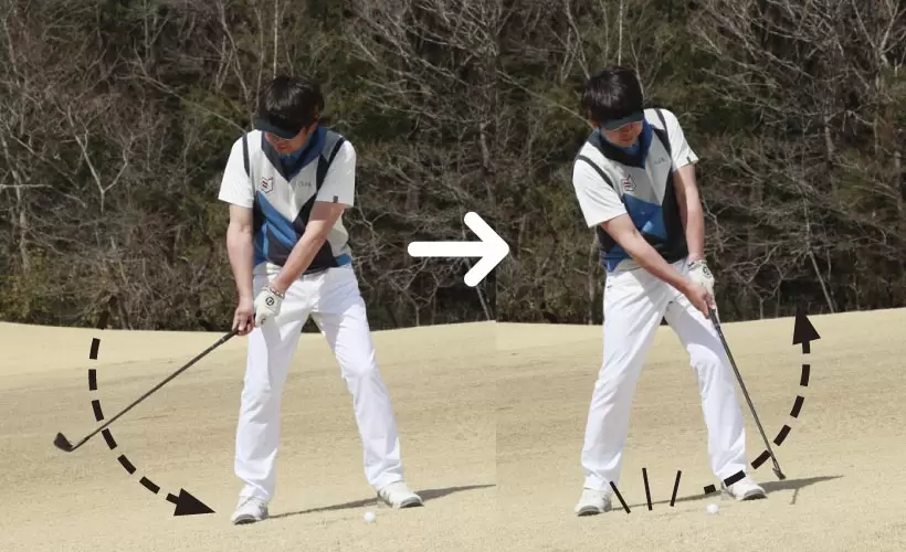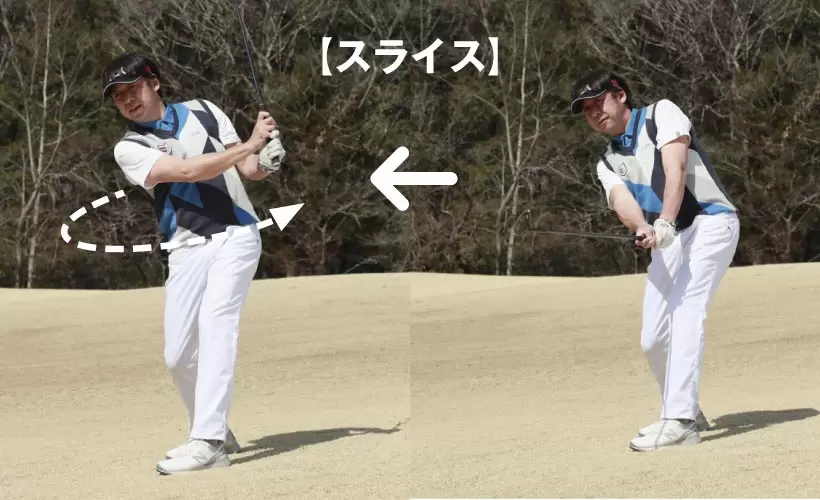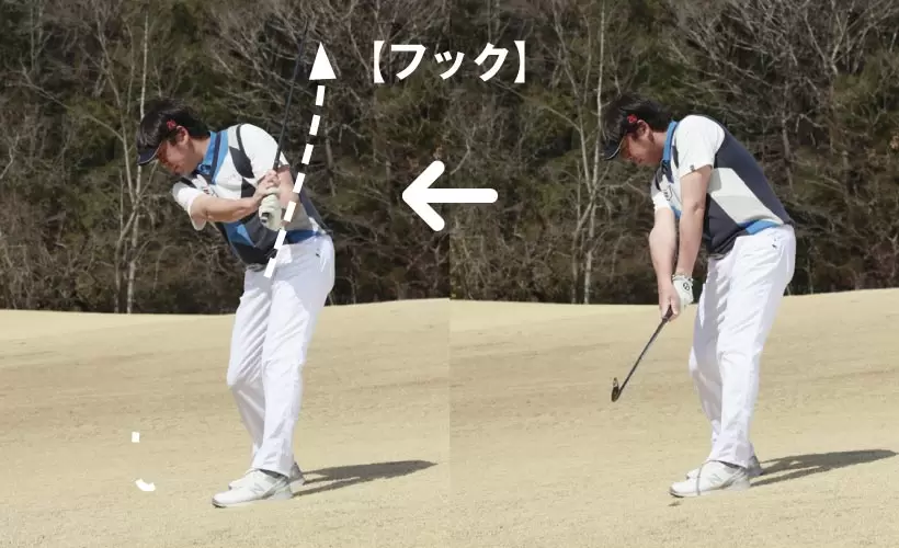 ツマ先下がりでは、スタンスを広く取るため下半身を固定しやすい。それを生かしてヘッドを積極的に走らせることで、軽いフックボールを打つ。