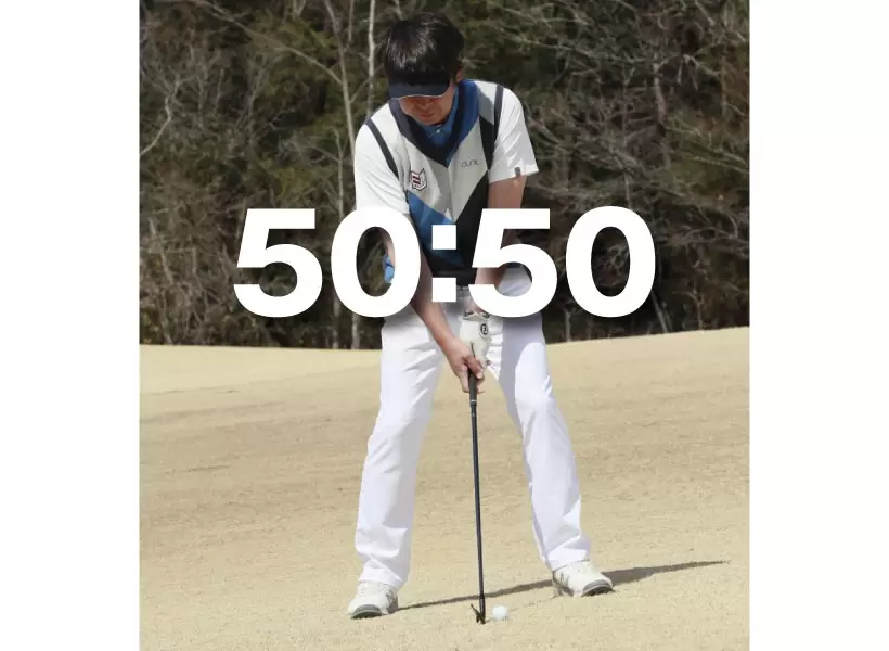 傾斜地に立つと、人間本来のバランスセンサーが働き、自然と前後左右均等にバランスよく立つはずだ。それを上手く生かして、スイング中のバランスを保ちながら打つ。