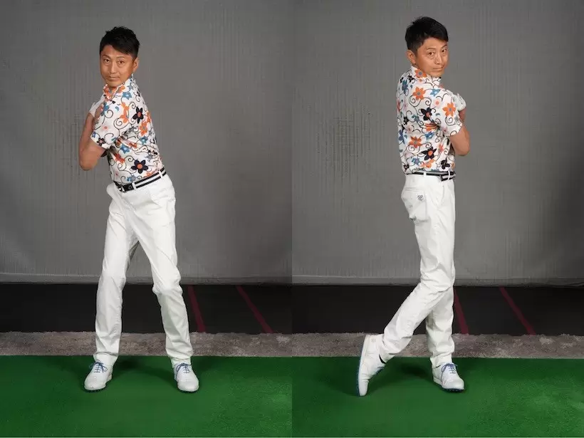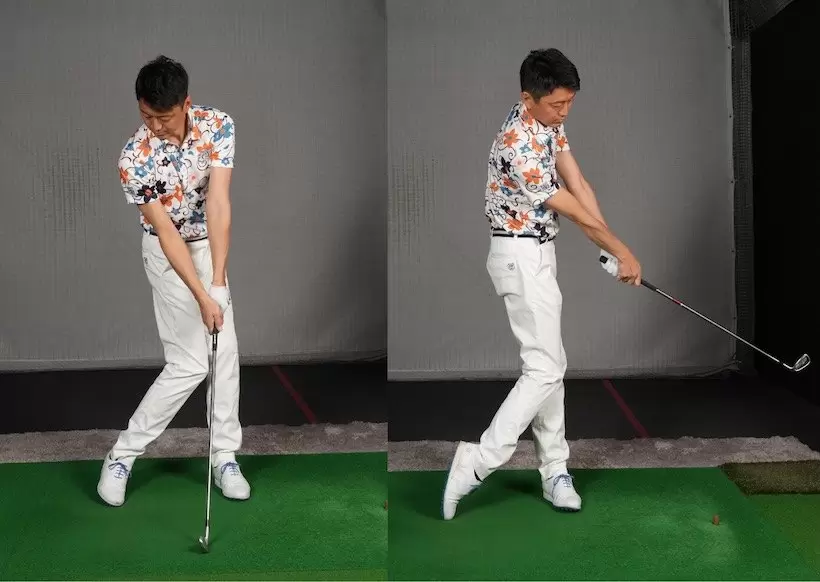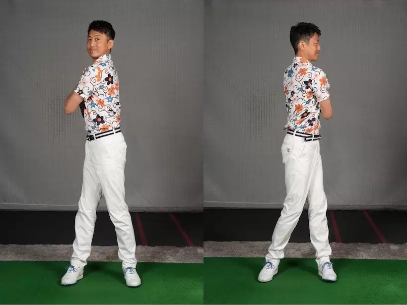 左のお尻から始動して腰を右に向けるとバックスイングに。クラブは体の正面にある。