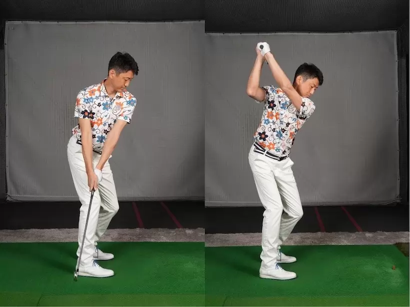 バックスイングで腰が右にヨコ回転しきったら腕をタテに振ってクラブを上げる。