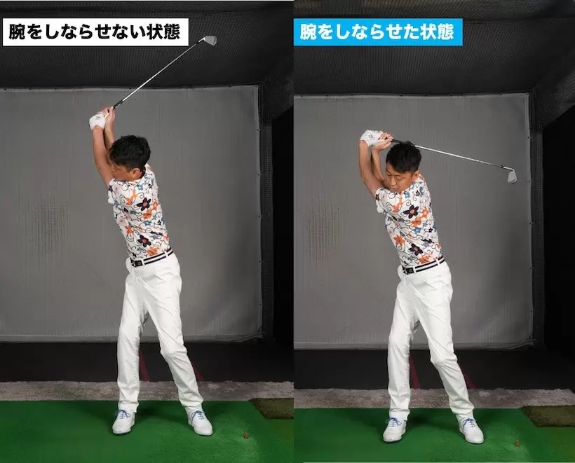 タテ振りで腕をしならせない状態が左、しならせた状態が右。しならせるとコックが入りヘッドの運動量が多くなる。