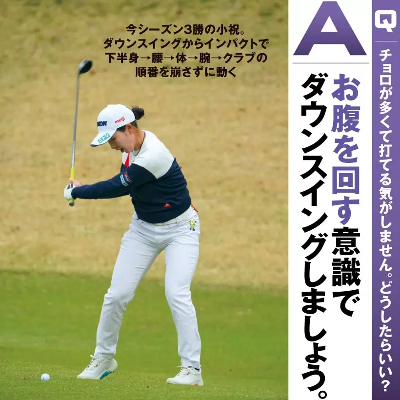 今シーズン3勝の小祝。ダウンスイングからインパクトで下半身→腰→体→腕→クラブの順番を崩さずに動く。
