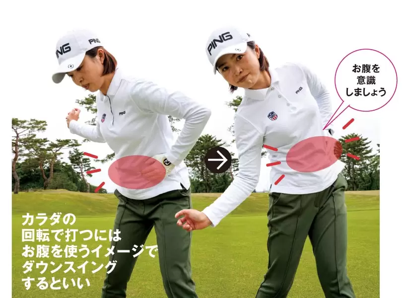 カラダの回転で打つにはお腹を使うイメージでダウンスイングするといい。