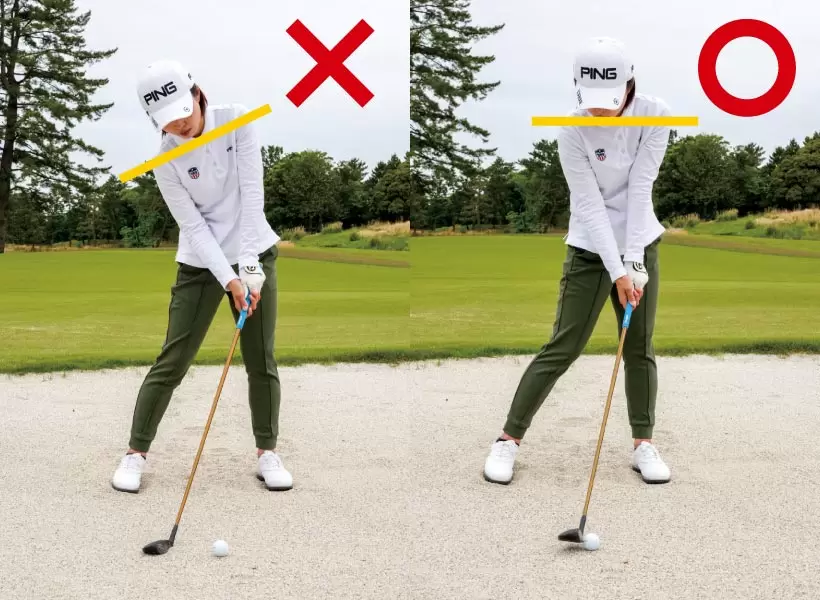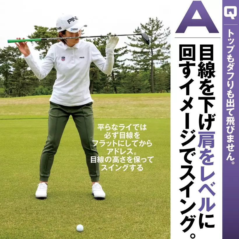 平らなライでは必ず目線をフラットにしてからアドレス。目線の高さを保ってスイングする。