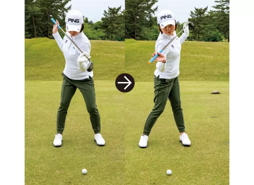 お腹が回らないとインパクトで詰まって伸び上がるが、お腹が回ればスムーズに振り抜ける。