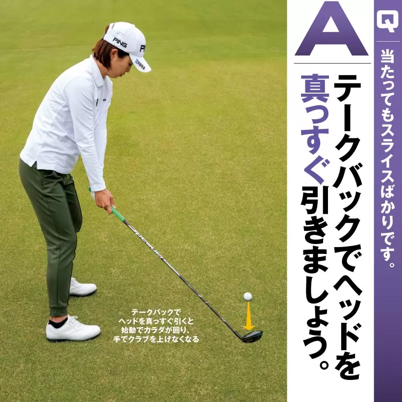 テークバックでヘッドを真っすぐ引くと始動でカラダが回り、手でクラブを上げなくなる。