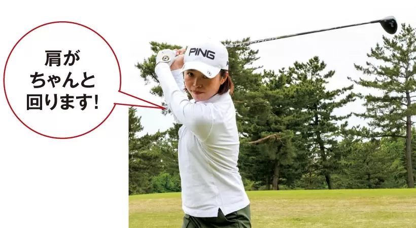 タメを作ろうとすると手が先に下りてインパクトが窮屈に。肩を動かしてクラブを下ろす。