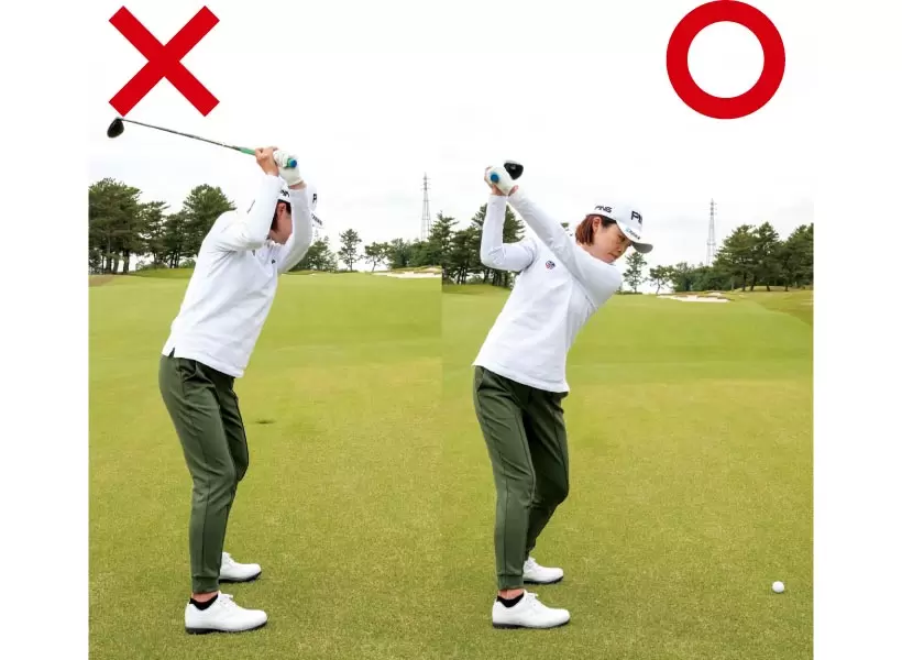ヘッドを真っすぐ引くとトップで胸が右を向くが、手で上げるとカラダが回らない。