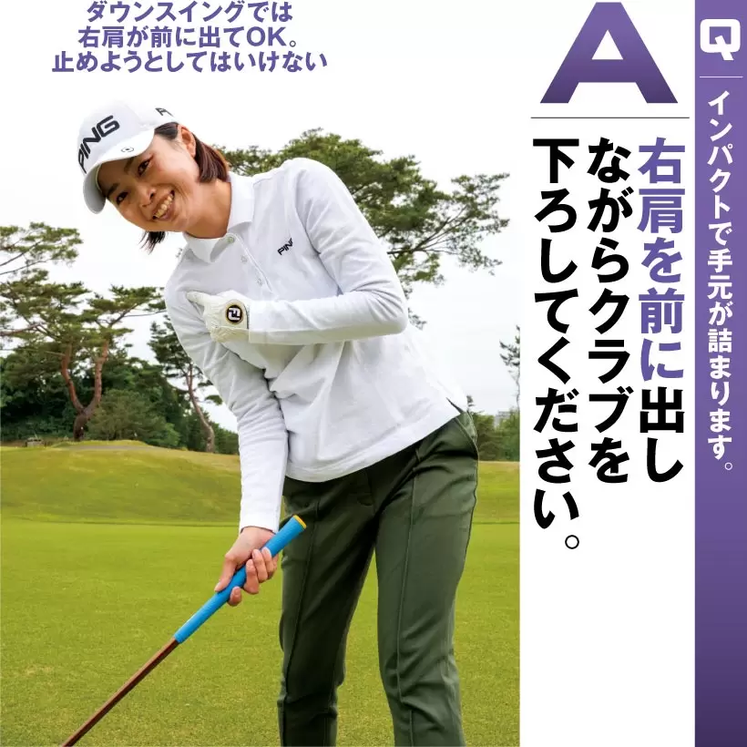 ダウンスイングでは右肩が前に出てOK。止めようとしてはいけない。