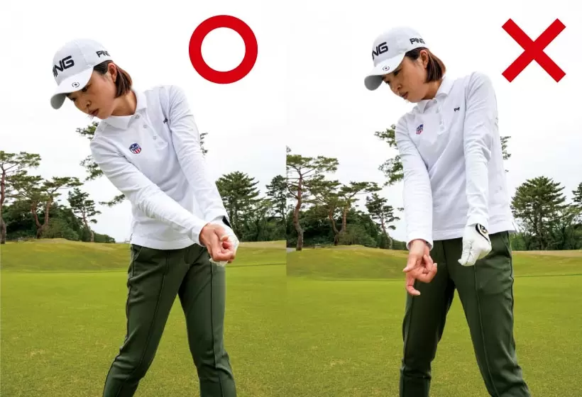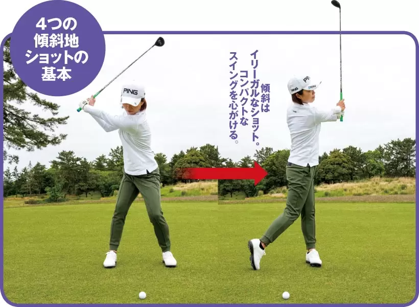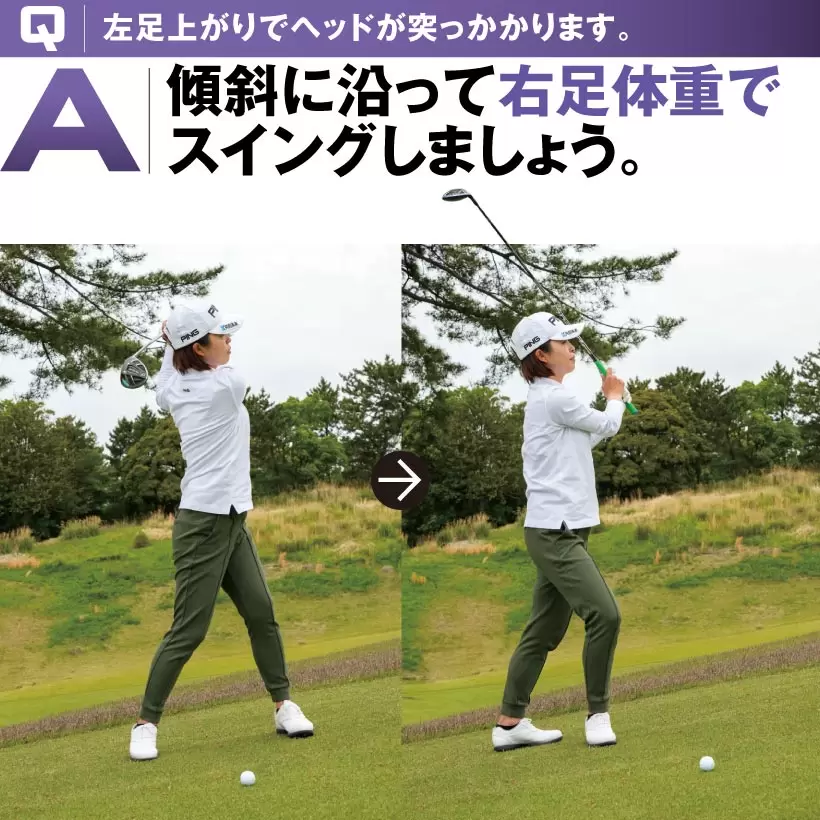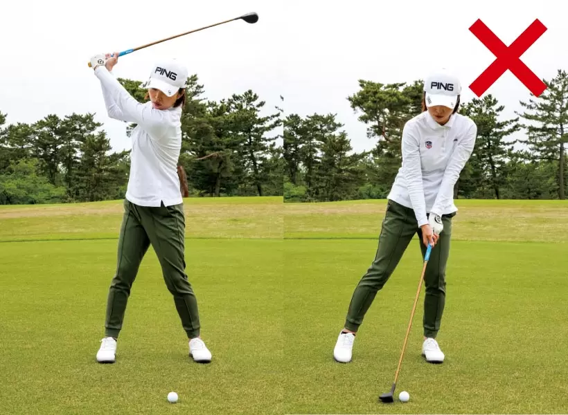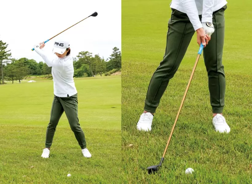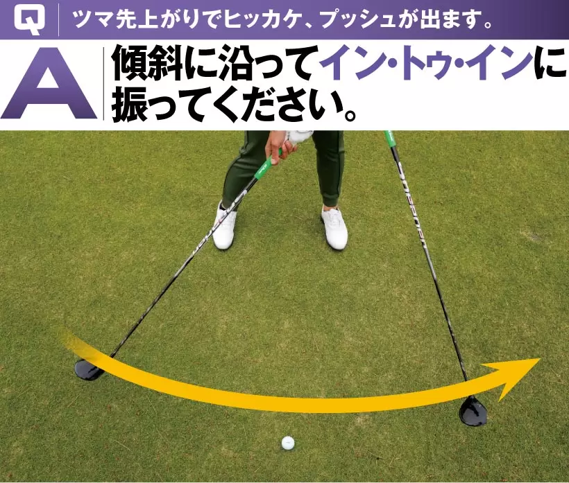 ヘッド軌道はイン・トゥ・イン。打ち急がないよう傾斜なりに振る。