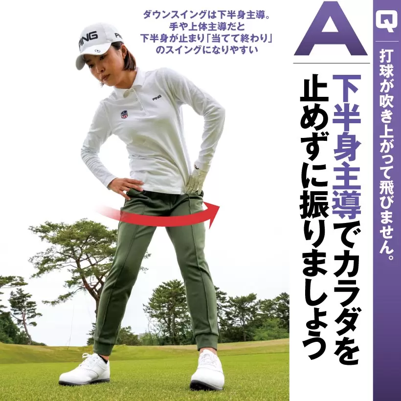 ダウンスイングは下半身主導、手や上体主導だと下半身が止まり「当てて終わり」のスイングになりやすい。