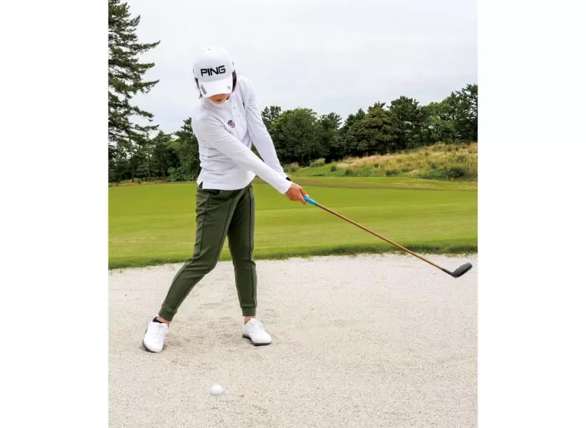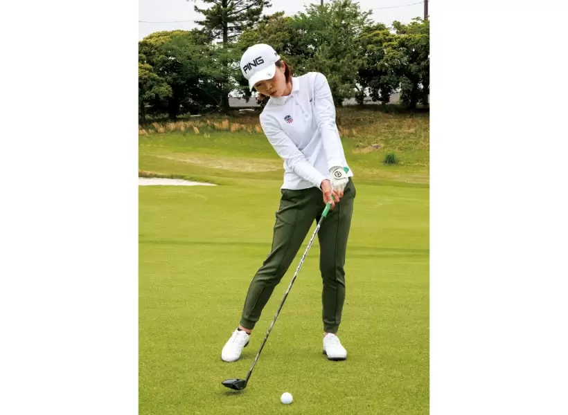 目標に届かせようとせず、手前からコロがすつもりでコンパクトにスイング。ボールの手前からソールを滑らすイメージをもつ。