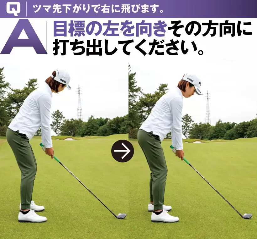 インパクトに向かって手が前に出るとフェースが開いてプッシュアウトする。