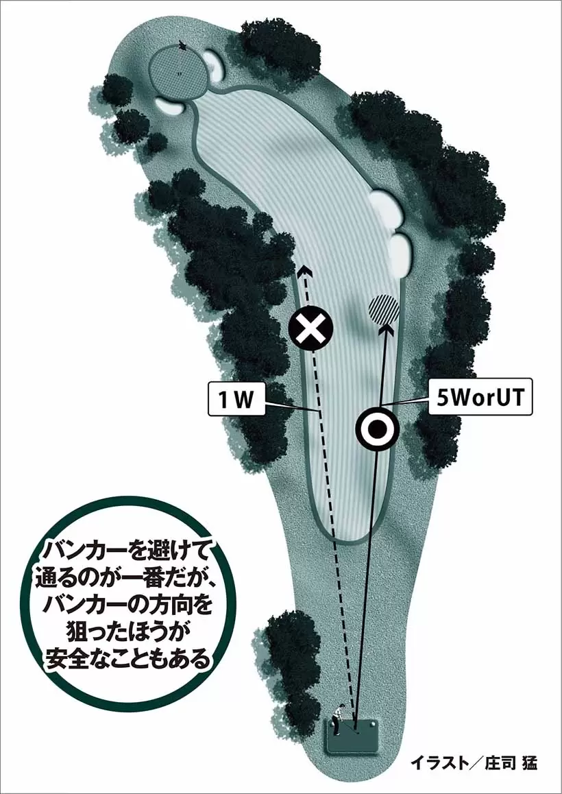 バンカーがティショットのベストルートを暗示しているケースも多い。バンカーに入れないためには、バンカーまで届かないクラブを選択しよう。