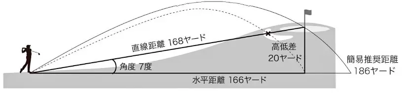 現在地からグリーンまでの水平距離と高低差、打つべき目安の距離がわかる高低差画面。