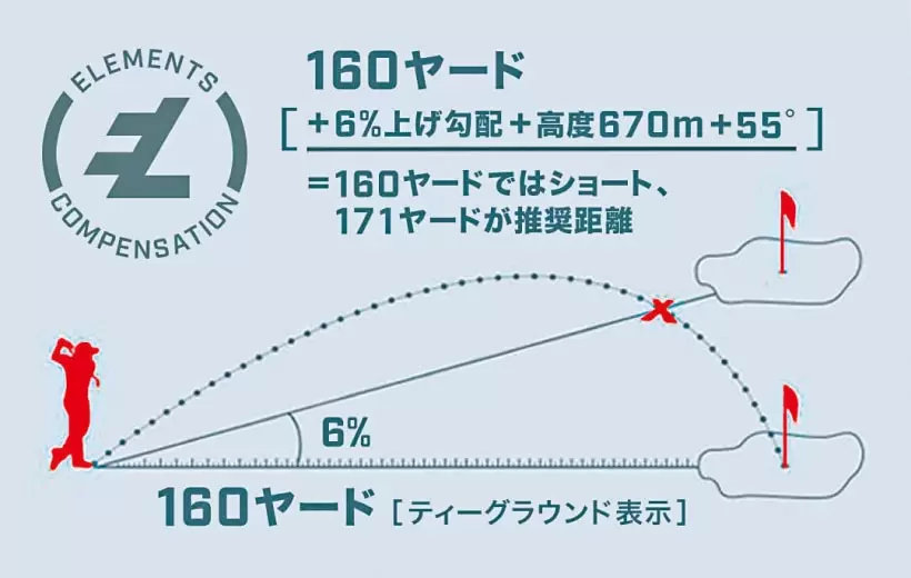 勾配を計算する「スロープ機能」と気温・高度による飛距差を加味する「エレメント機能」を搭載。
