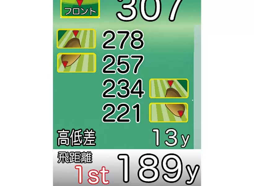 ハザードまでの距離と現在地からグリーンまでの高低差が表示されるので番手が選びやすい。