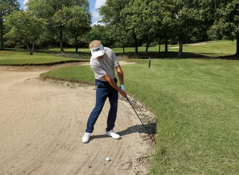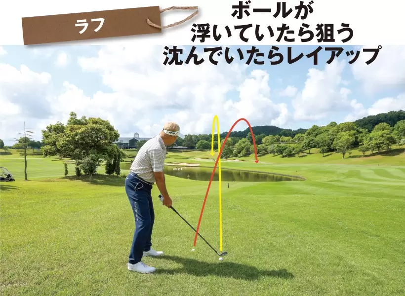 アゴの近くに止まった場合は大きな番手だとボールが引っかかったり、フォローでクラブが当たったりする。小さめの番手を持つなり出す方向を変えるなりしよう。
