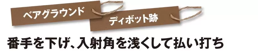 [ベアグラウンド][ディボット跡]番手を下げ、入射角を浅くして払い打ち