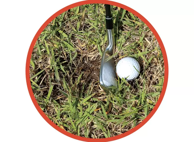 ベアグランドやディボット跡手前のボールは、ヘッドを下にもぐらせるのが難しいので払い打つ。