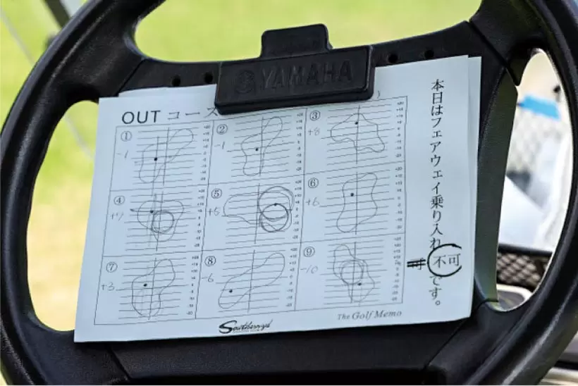 残り距離だけでは番手を選べない。ターゲットエリアと使用番手を決めるのにピンポジションシートは必携アイテムだ。