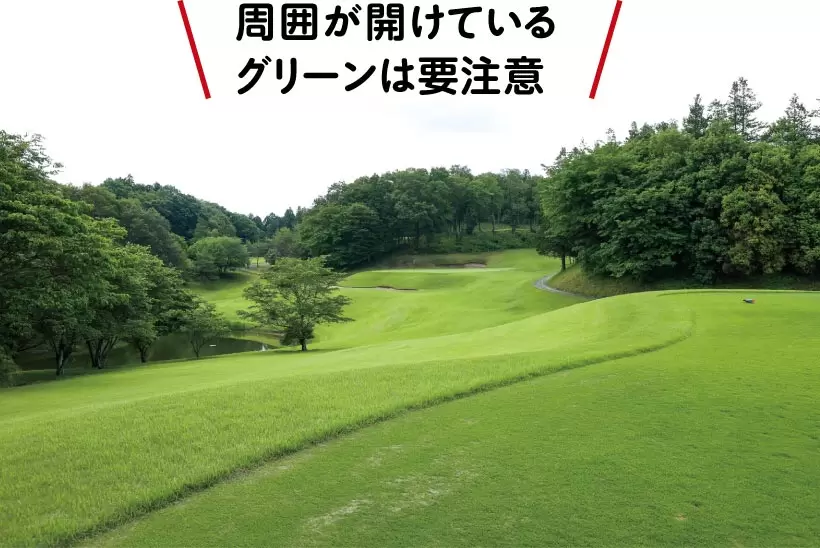 周囲が開けているグリーンはティーイングエリアと風の向きや強さが違っていることが多いので要注意。
