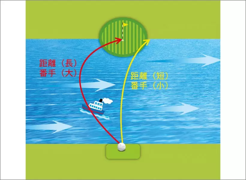 横風は川の流れと考えるとイメージしやすい。泳ぎやボートで川を渡る場合、真っすぐ対岸に向かおうとすると最初に川の流れに逆らうので移動距離が長くなるが、少し右に流されてもいいなら距離は短くなる。ピンを狙うならより大きな番手が必要だし、乗せるだけなら小さな番手で済む。