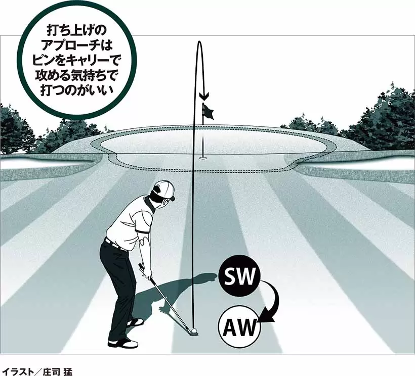 砲台グリーンに向かって打つときは、グリーンの面やピンの根元をイメージしよう。通常SWを使う人なら一番手大きいAWで打つのがいい。