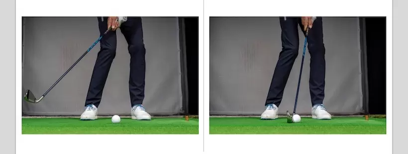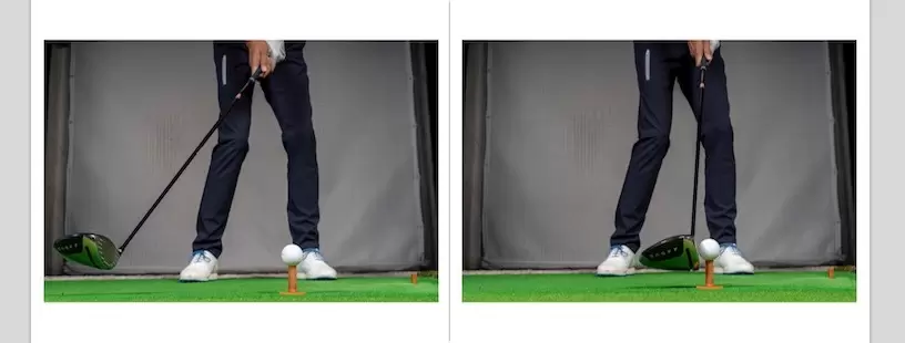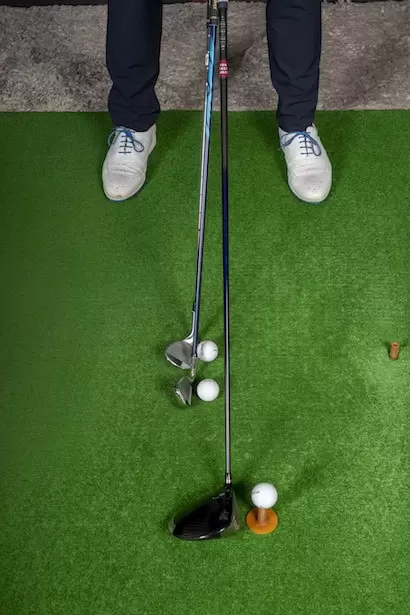 長いクラブでは、ボールが右すぎるとロフトが立って当たったり、ダフりやすくなるためボール位置を左寄りにする。