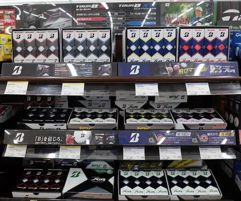 売り場にずらりと並ぶ『TOUR B JGR』。現在、展開しているカラーはホワイト、パールホワイト、イエロー、パールピンク、マットレッドの5種類。さらにゴルフ5では「オリジナルグリーンマーク」のJGRボールが展開中!