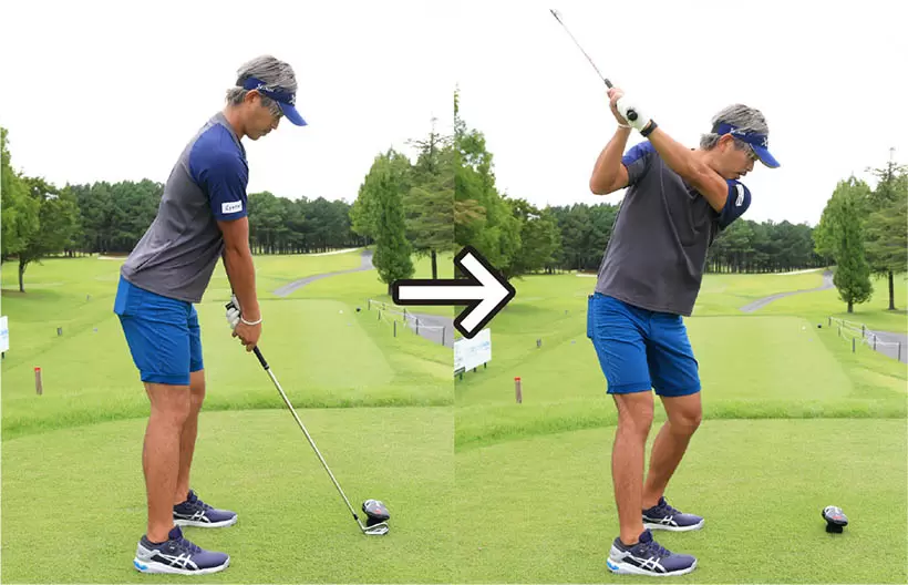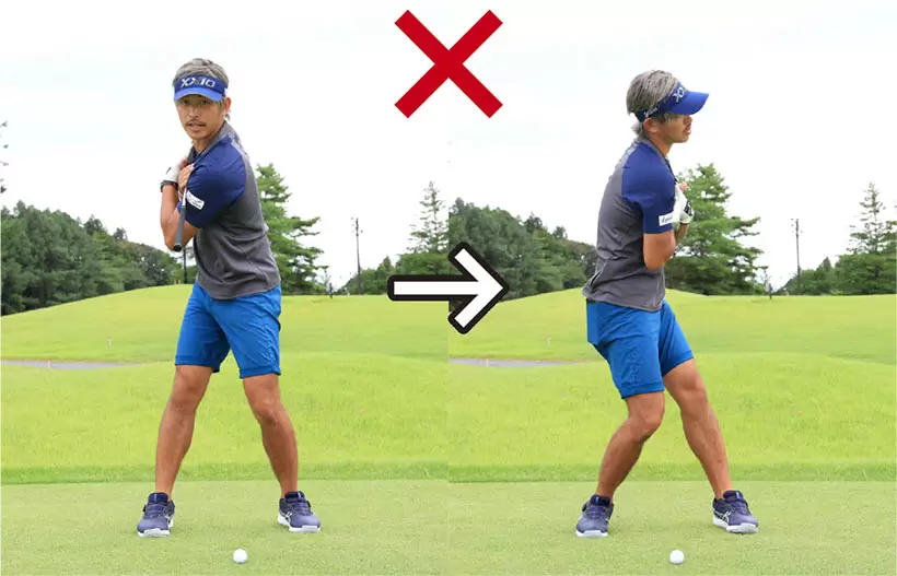 スライスやプッシュがよく出る人は、切り返しで胸が早く開いて右肩が前に出てしまっている。