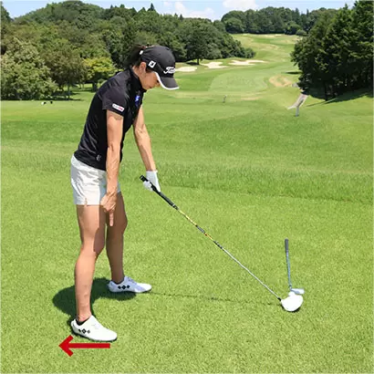 スクエアな構えから右足を少し後ろに引いて、カラダの全体を目標よりもやや右を向ける。