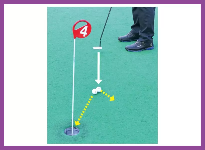 ボールの前後2箇所、30センチくらい離れた場所にスパット(目印)を置き、ヘッドをその上に通す練習。スパットはドローやフェードの軌道を確認するときにも使える。