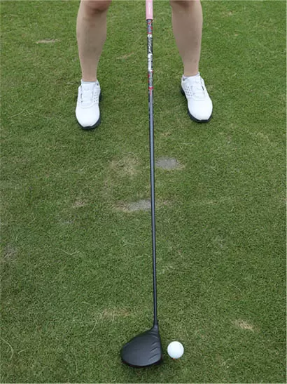 バランスよく立つには、まず直立の姿勢になり、おヘソの少し下にクラブを当てて背中側に押そう。