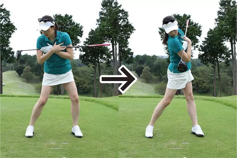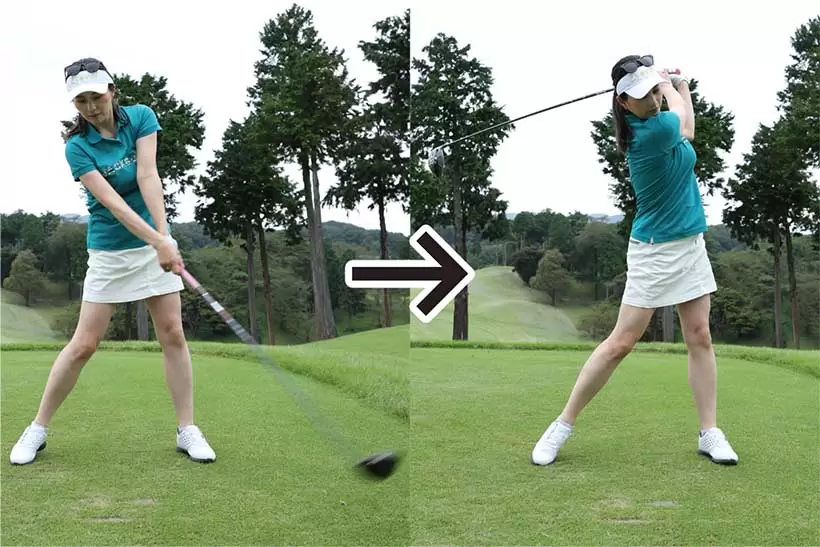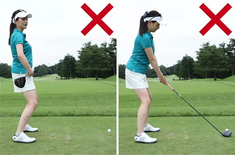 下半身を固めすぎるとバックスイングが手上げになったり(左)、インパクトで上体が起きたり(右)しやすい。