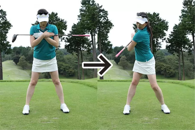 前傾姿勢を作り、クラブを胸の前に水平に当てる。そして上体を右に90度回して回転の圧を右股関節でしっかり支えよう。