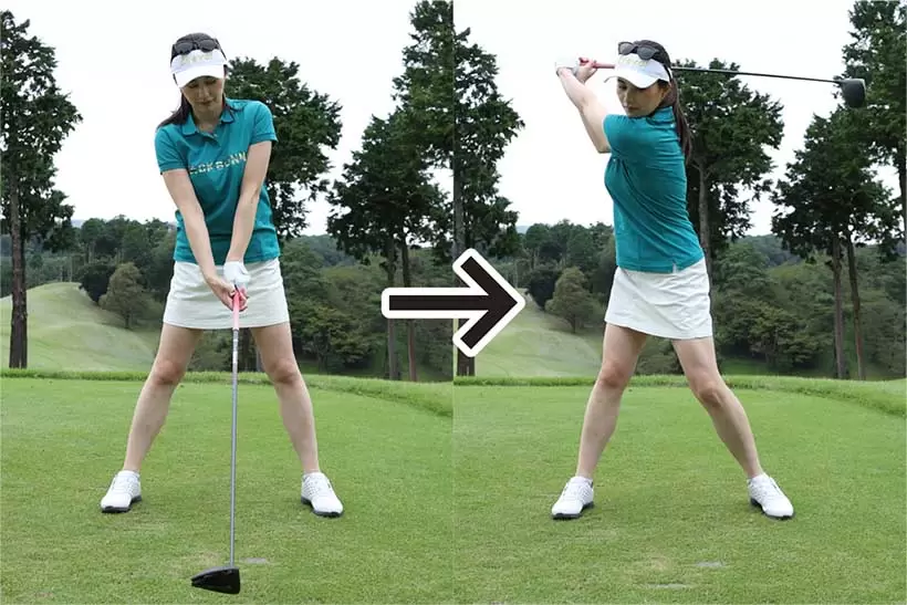 股関節が稼動しやすいスタンスで構えれば、バックスイングで重心が右の股関節にスムーズに乗る。