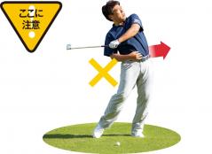 アマチュアの多くは、インパクト前にお腹が上を向いてしまうタイプが多い。お腹が上を向くとあおり打ち軌道になってしまうため、ダフリやすくなる。