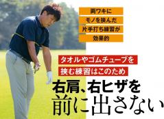 ゴムチューブで両腕を自由に動かないようにすると腕が体から離れないので、右肩が前に出なくなる。最初は右手の片手打ちで、右肩の動きをチェックしよう。