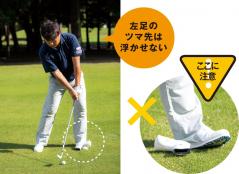 足元の動きを安定させるために、左足はベタ足をキープしているのが理想。チーム辻村では左足のツマ先側にパターのヘッドカバーを置いて、それを落とさないように練習している。