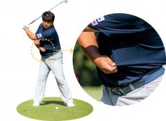 右腕はワキからヒジまでしっかり体にくっつけておく。始動からハーフウェイバックまでは右腕と右のお腹が一体化したまま動かす。右ヒジが体から離れるのはNG。